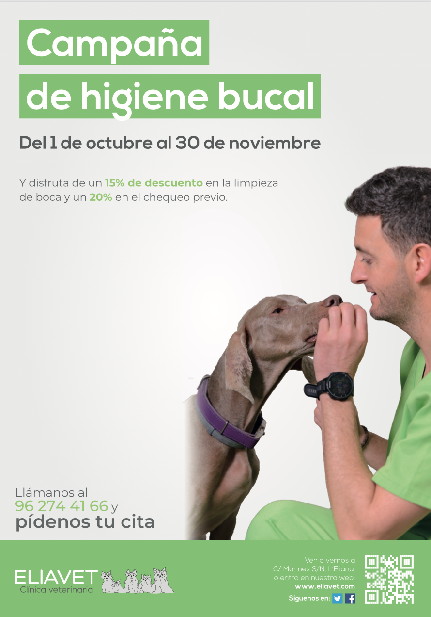Si es necesario realizarle una limpieza bucal a tu mascota, en Eliavet tenemos en marcha durante diciembre, la campaña de Higiene Bucal. Te ofrecemos un descuento del 15% en la limpiea y un 20% en el chequeo previo. Puedes pedir cita en la clínica o llamando por teléfono: 96 274 41 66